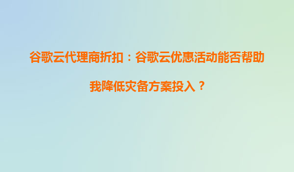 2025-09-16谷歌云代理商折扣:谷歌云优惠活动能否帮助我降低灾备方案投入? 引言 在数字化转型的浪潮下,企业对灾难恢复(DisasterRecovery,DR)和业务连续性(BusinessContinuity,BC...