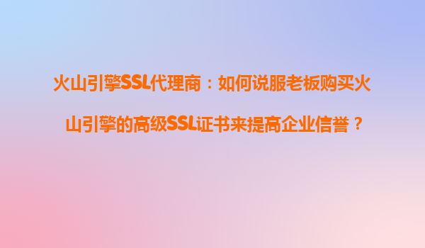 火山引擎SSL代理商:如何说服老板购买火山引擎的高级SSL证书来提高企业信誉? 1.理解SSL证书对企业信誉的重要性 在当今数字化时代,企业信誉是吸引客户和维护市场份额的关键因素之一。SSL证书(SecureSoc...